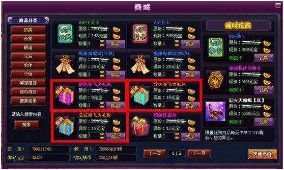 商城限时热卖将以超值优惠价出售【角色突飞大礼包】、【异火突飞大礼包】、【宝石突飞大礼包】,每天限量出售,不要错过机会喔!