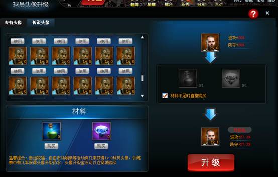 1.    玩家可以在自由市场刷新奖励和祝福活动中有几率获得LV.0的球员头像,玩家原有的专有头像默认为Lv.0,已经使用球员头像将会脱落放于球员头像升级界面的球员头像栏中;