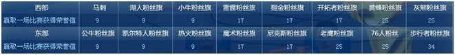 当经理所选的粉丝旗球队,在季后赛的比赛中赢得一场胜利,经理能增加相对应的荣誉值,以下为季后赛的比赛中,每个球队赢得一场比赛获得的荣誉值: