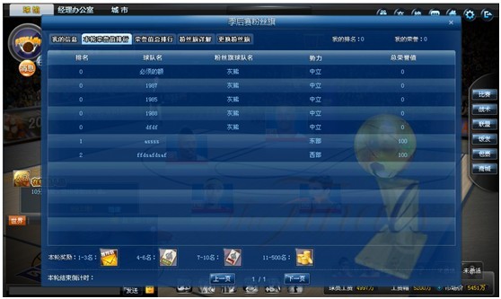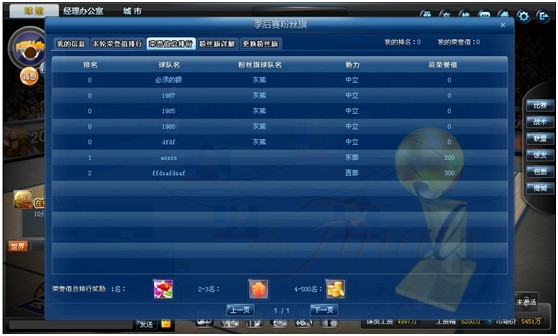 1. 每轮(上周礼拜六22点30分—本周礼拜六22点30分)根据排名发放奖励。1-3名的球队发放“穆大叔的推荐信”;4-6名的球队发放“底薪巨星卡”;7-10名的球队发放“底薪替补卡”;11-50名的球队发放“50饭卡”;51-100名的球队发放“30饭卡;”101-200名的发放“20饭卡”;201-500的球队发放“10饭卡”。(排名:如果荣誉值一样,则根据玩家的人品值的多少决定哪个玩家排前面,人品值多的排前)