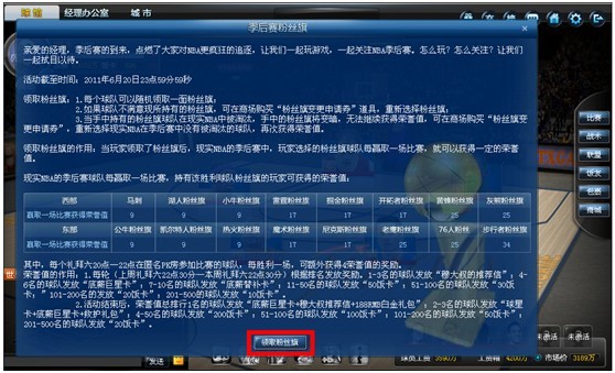 如果玩家支持的(粉丝旗)球队在季后赛中被淘汰出局,手中的粉丝旗将变暗,无法继续获得荣誉值(包括比赛获得荣誉值),可在商场购买“粉丝旗变更申请券”,重新选择现实NBA在季后赛中没有被淘汰的球队,再次获得荣誉值。
