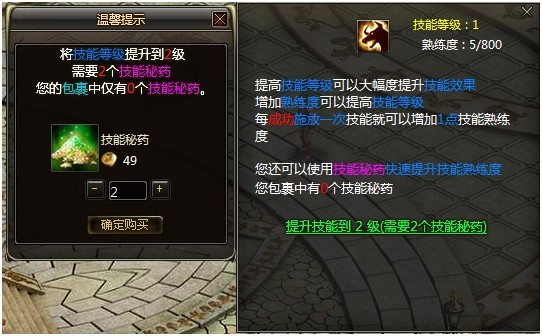 若背包内没有技能秘药,则会弹出购买界面。