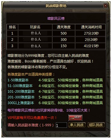 其中难度等级可以根据自己的能力来选择,自己还可以选择是单独挑战还是组队挑战,如果您是VIP玩家,可以每天免费通关一次。如果你不是VIP权限,可以点击“VIP特权”。