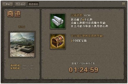 【活动内容】:在活动当天国王可以发布奇迹建设,在特定时间开展奇迹资源争夺战,各国国民进行资源争夺,获取完成奇迹建设所需要的资源数量,建设完成后即可获取国家宝箱的奖励!